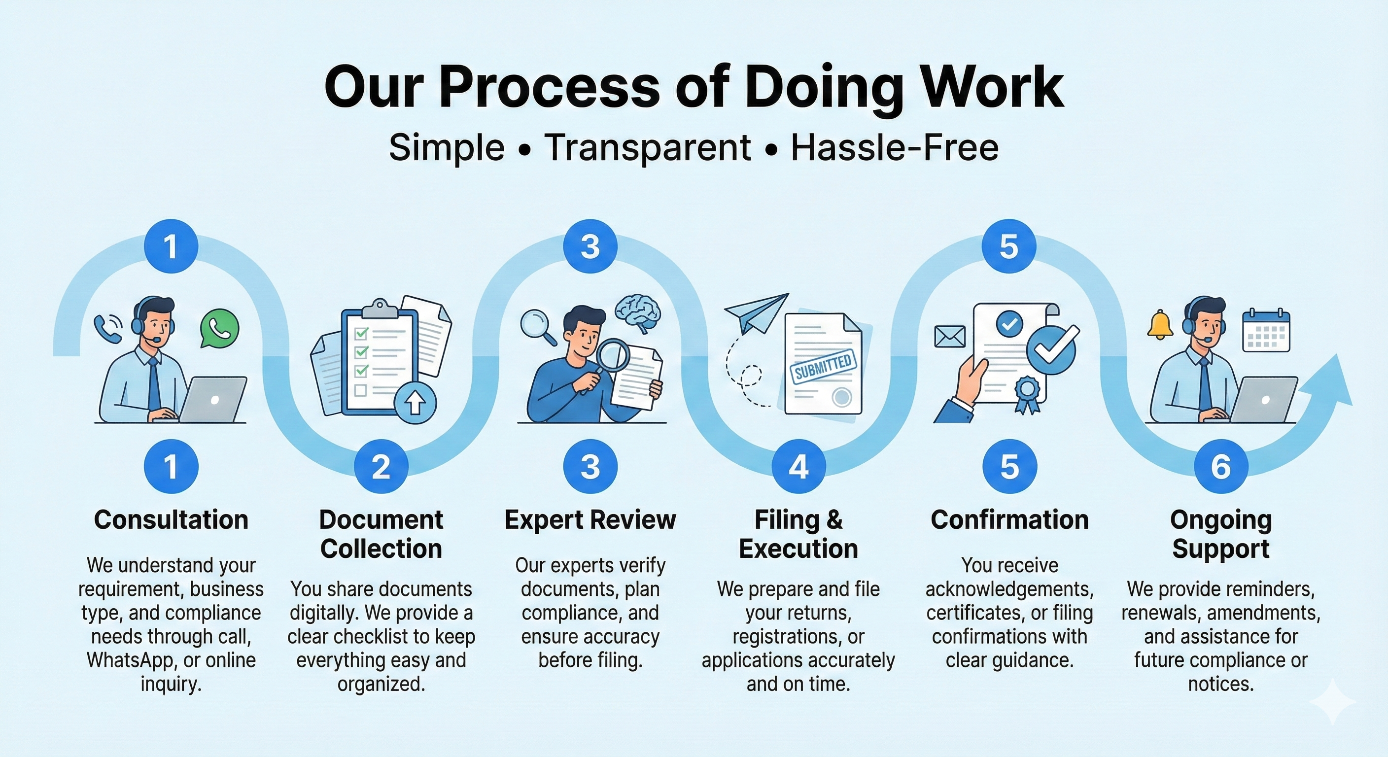 We assist with company formation, GST registration, MSME, and other essential licenses to legally launch your business with confidence.